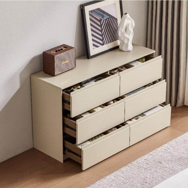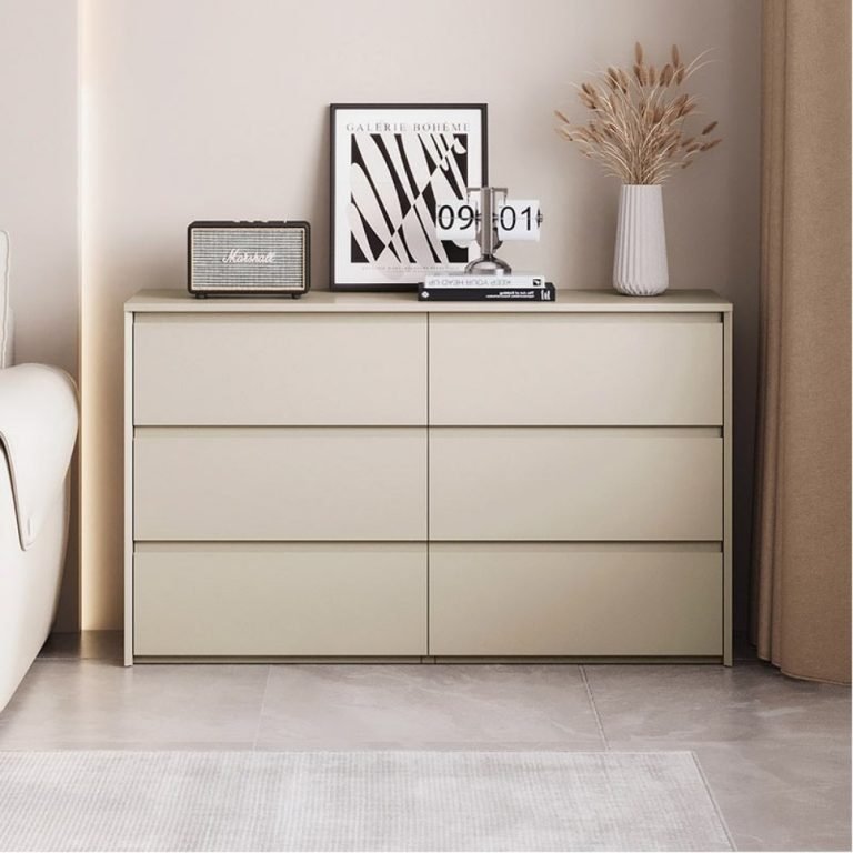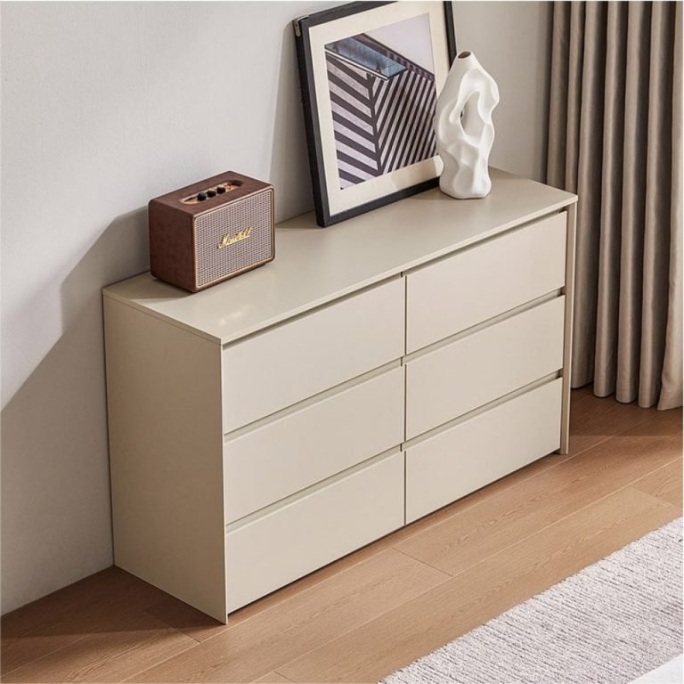The six spacious drawers glide open smoothly, offering room for clothing, linens, accessories, and other essentials. Its wide top surface is perfect for décor pieces, plants, candles, or even a compact TV — effortlessly elevating any space.