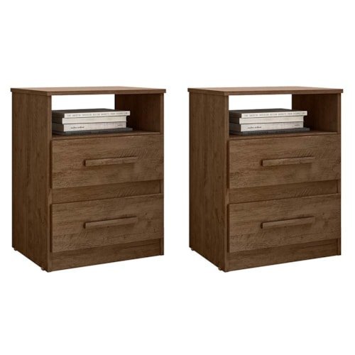 The two-tone brown/hazelnut finish adds warmth to any space, while bronze handles give it a clean, polished look. With two drawers and an open shelf, you’ll have plenty of room for essentials like books, chargers, and personal items—right where you need them.