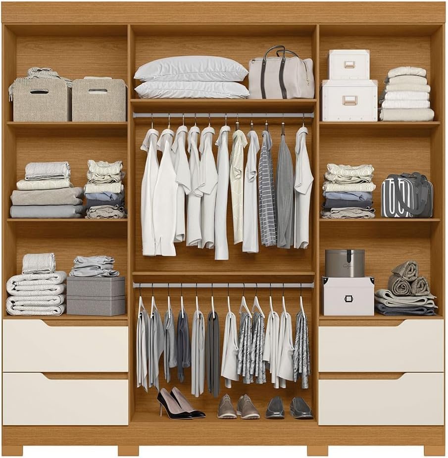 This large wardrobe features four swing doors, four smooth-glide drawers, and six internal shelves, making it ideal for organizing clothing, accessories, and essentials with ease. The off white Cina finish adds a clean and elegant look that blends effortlessly into modern and classic bedrooms.